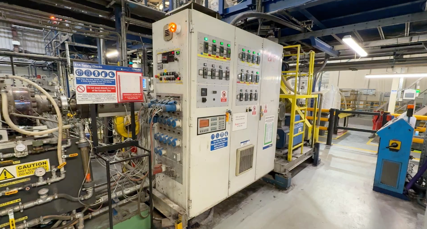 • 90-mm-Battenfeld-Extruder mit einem Corma 820-6M-Corrugator, Abzug, Säge und Tisch